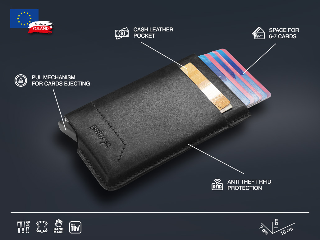 Pagaminta iš augalinio rauginimo Nomad odos. Kruopščiai detalizuotas ir papuoštas siūlėmis. Neįtikėtinai talpus – sutalpins daugybę kortelių ir dokumentų, suteikdami lengvą prieigą prie jų dėl specialaus laipsniško išstūmimo mechanizmo. Papildomos dvi kišenės padės sutvarkyti turinį ir tuo pačiu puikiai atrodyti. Dėl piniginės konstrukcijoje naudojamos RFID blokavimo technologijos jūsų jautrūs duomenys ir kredito kortelių lėšos yra visiškai saugūs ir apsaugoti nuo neteisėto nuskaitymo ar vagystės. Pagaminta rankomis, kruopščiai – kad jūsų naudojimas būtų visiškai patenkintas.