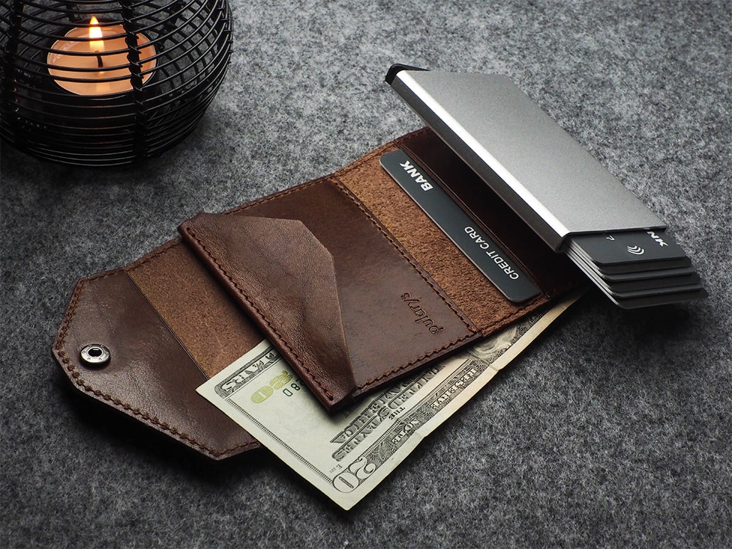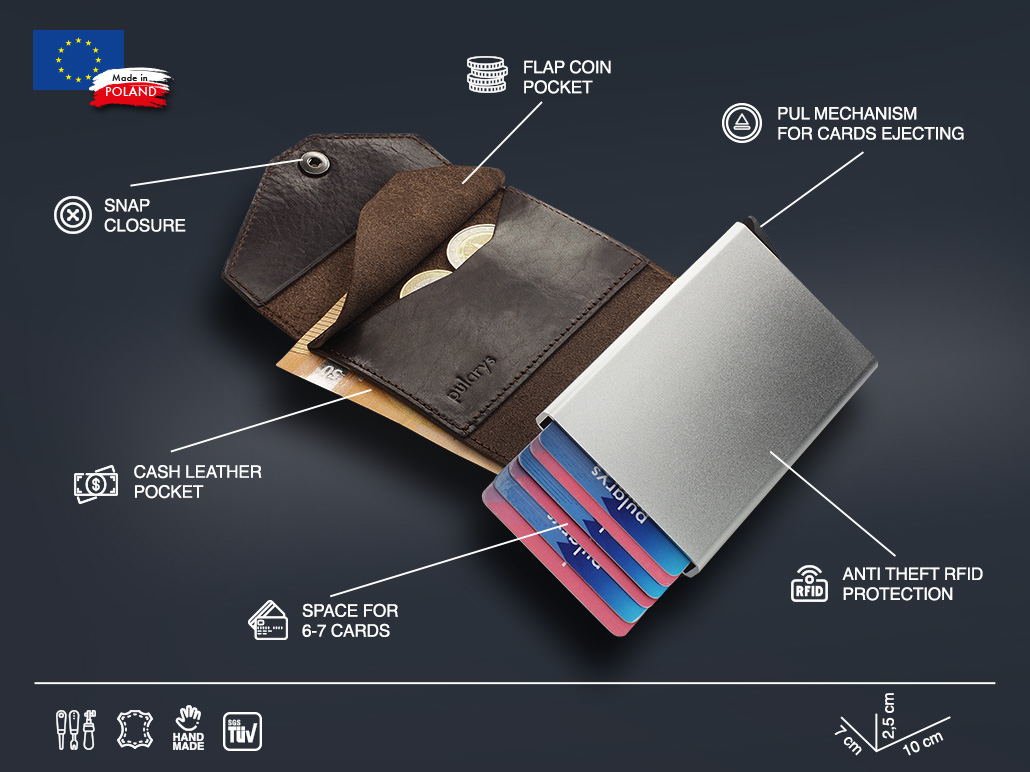 Nuostabiai talpi – talpins daug mokėjimo kortelių ir dokumentų. Specialus laipsniško kortelių išstūmimo mechanizmas – „pulsas“, užtikrina greitą ir lengvą prieigą prie jų. Elegantiškas šios piniginės funkcionalumas taip pat apima papildomą banknotų kišenę ir kišenę monetoms. Dėl RFID blokavimo technologijos, naudojamos jos konstrukcijoje, jūsų jautrūs duomenys ir kredito kortelių lėšos yra visiškai saugūs ir apsaugoti nuo neteisėto nuskaitymo ar vagystės.