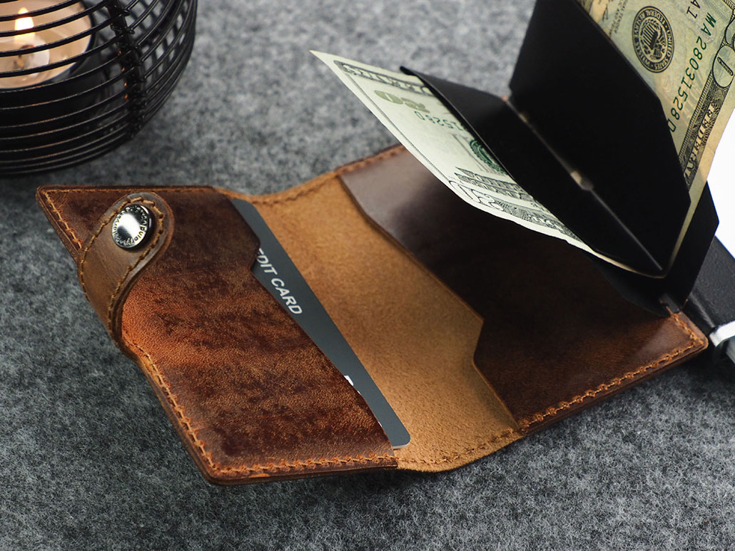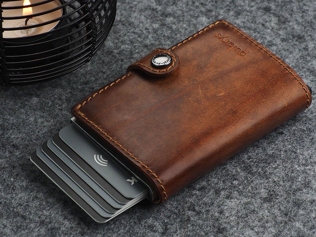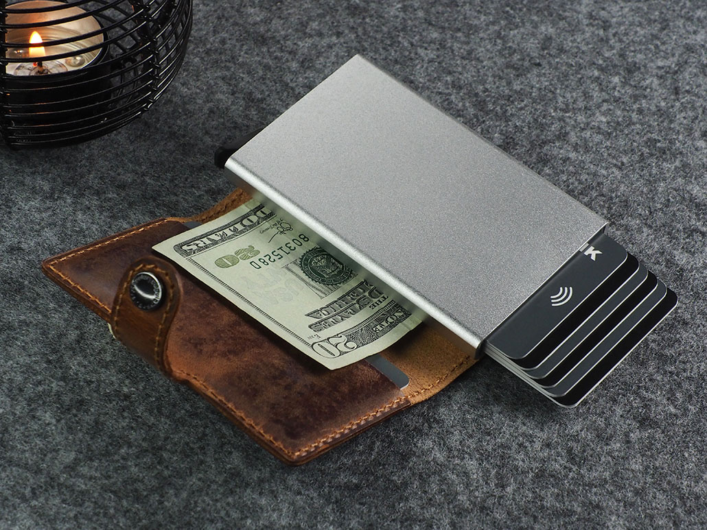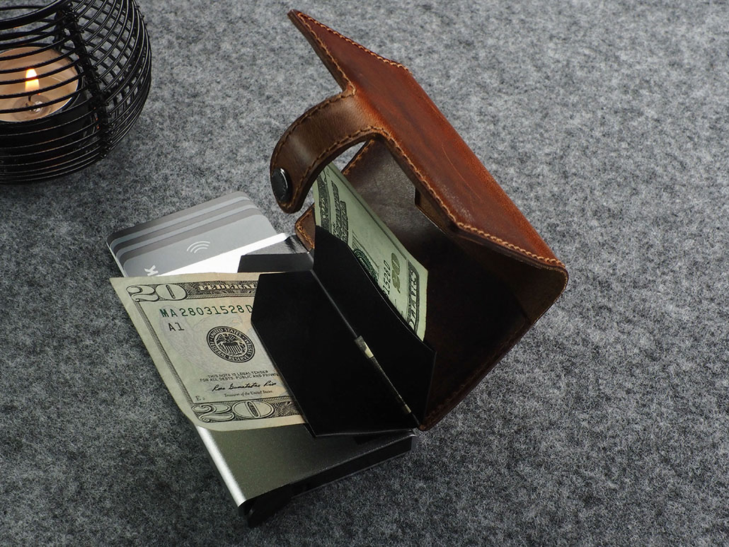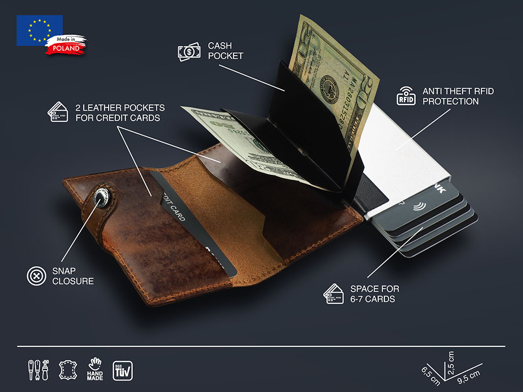 Dvi lengvai pasiekiamos kišenės puikiai tinka dokumentams, kortelėms ar vizitinėms kortelėms. Dėl piniginės konstrukcijoje naudojamos RFID blokavimo technologijos jūsų jautrūs duomenys ir kredito kortelių lėšos yra visiškai saugūs ir apsaugoti nuo neteisėto nuskaitymo ar vagystės. Specialus laipsniško išstūmimo mechanizmas leidžia greitai pasiekti tai, ko ieškote. Registruotas dizainas – unikalus ir originalus!